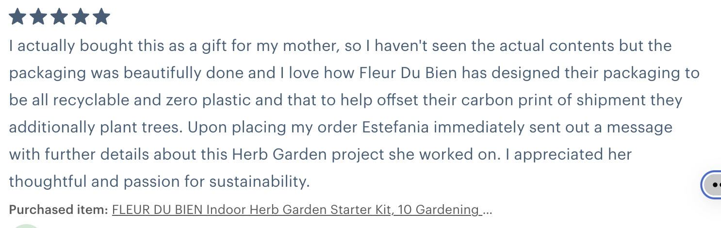 At Fleur Du Bien we provide products that have into consideration the environment. Our packaging has no plastic, it's so beautiful that you can reuse and we offset our carbon print by planting trees.