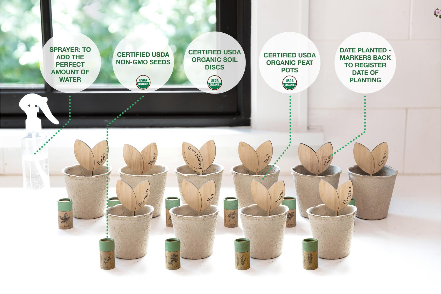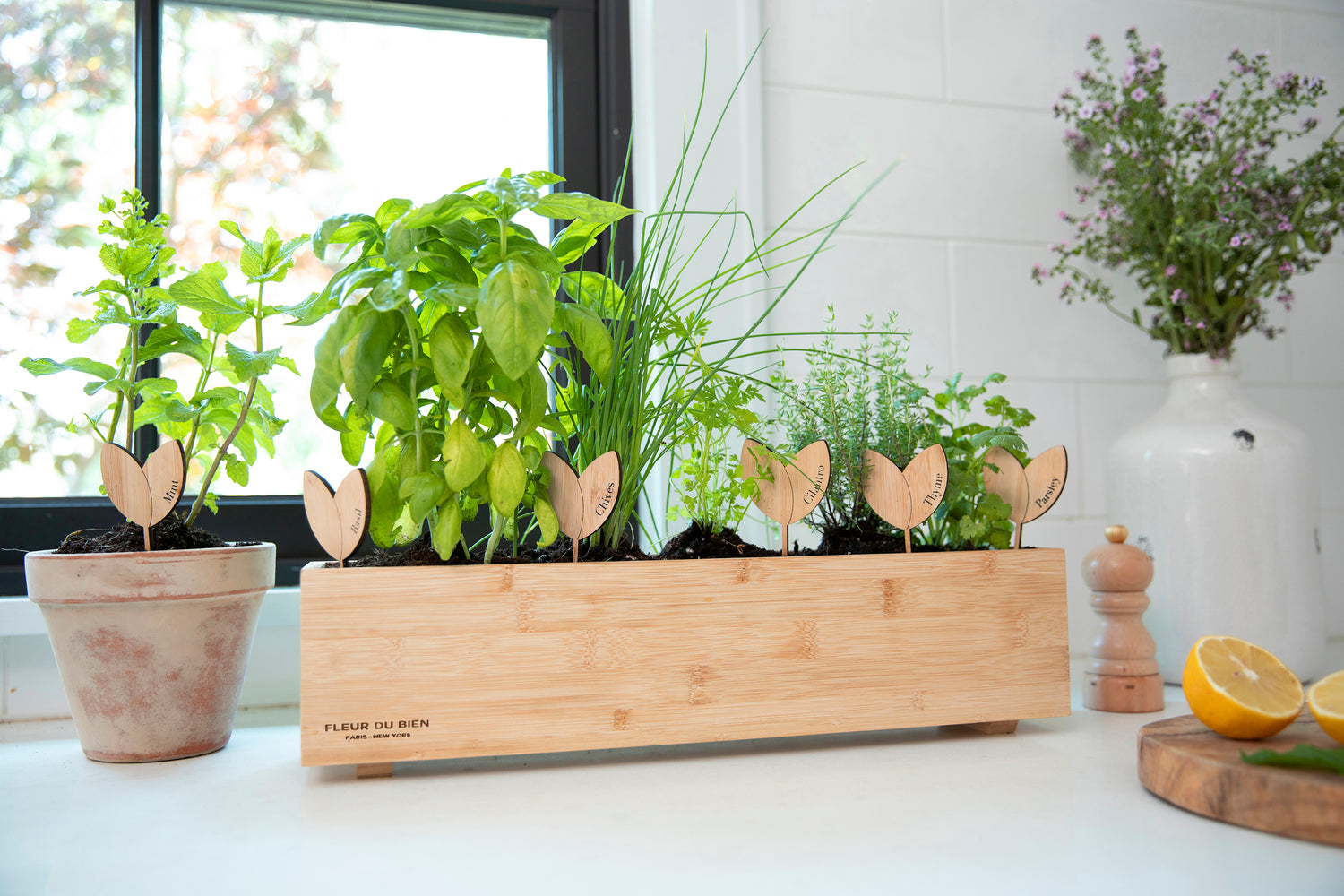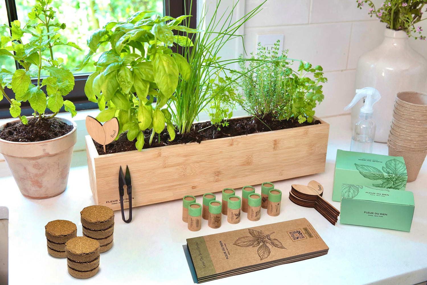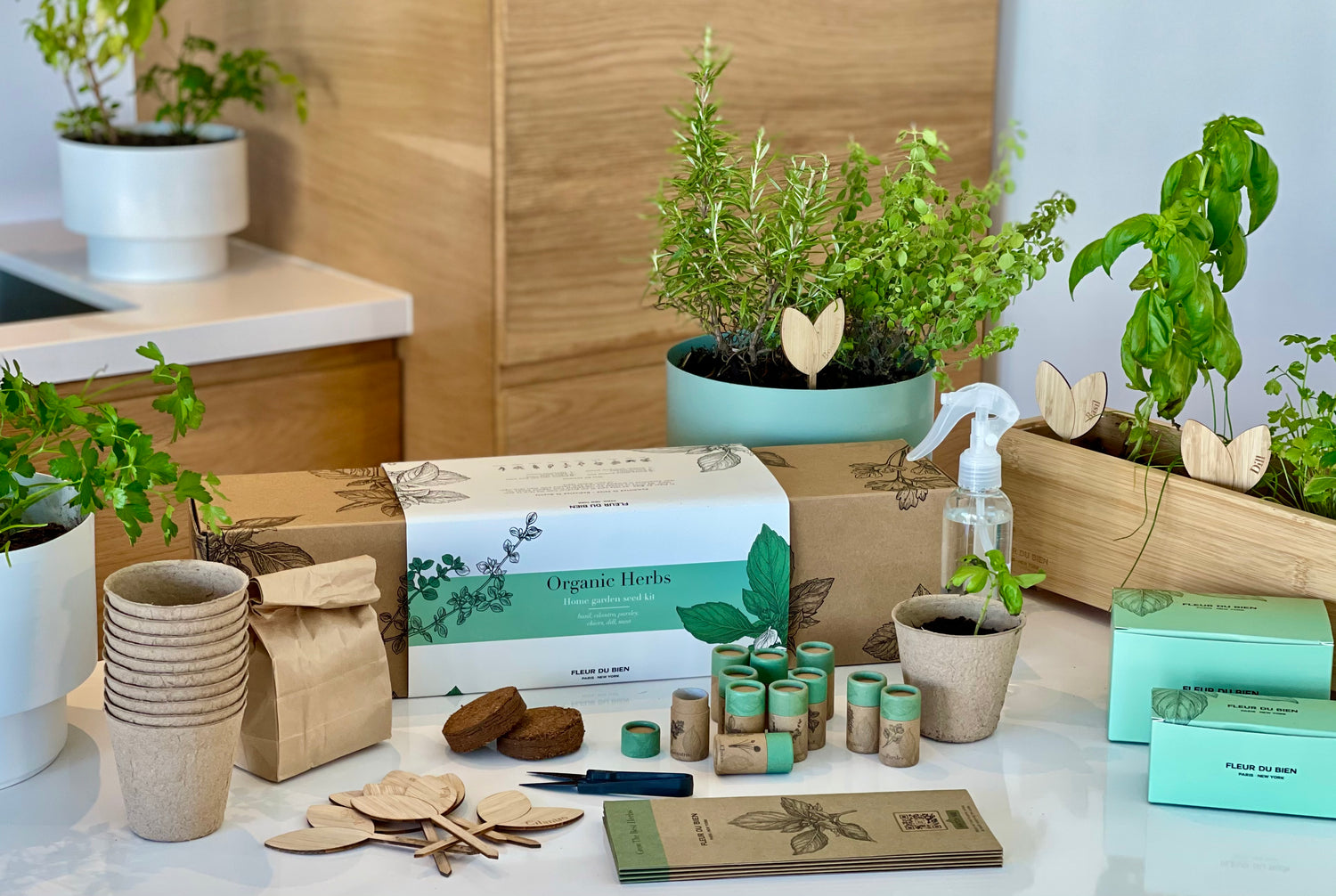 At FLEUR DU BIEN, we wanted to bring you a 6 herb garden starter kit that would give you the freedom to start your own garden on your window sill or in your kitchen without any of the hassles!